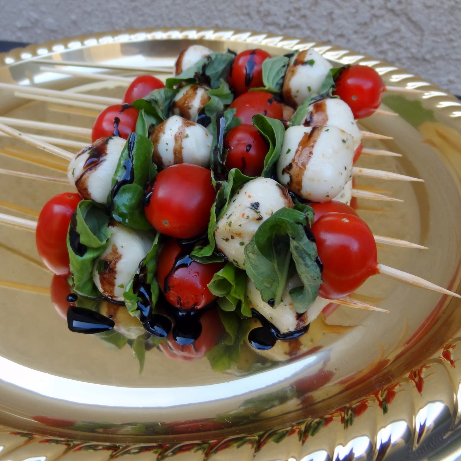 You can make your own reduction, or cheat like I did and purchase it ready-made. I even went so far as to get mozzarella that was already marinated, but you can also marinate your own if you can't find them already in olive oil. You may think I'm lazy (that would be a totally sound assumption, by the way) but I like to have party bites that are fast and easy to make so I can focus on the main dishes, or just having fun. This is a ridiculously easy recipe.